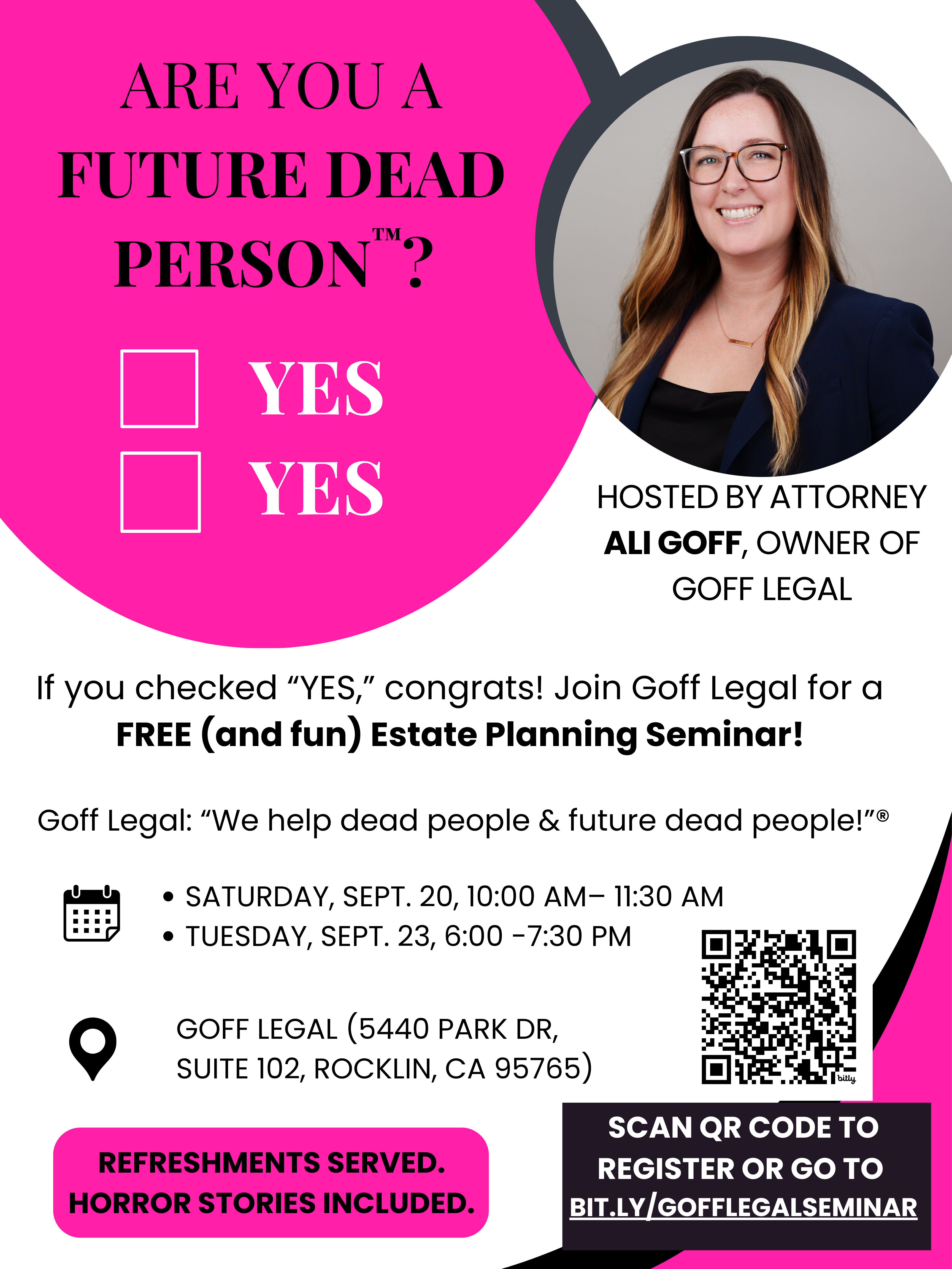 Join Goff Legal for a free, fun, and informative Estate Planning 101 Seminar, hosted by firm owner Ali