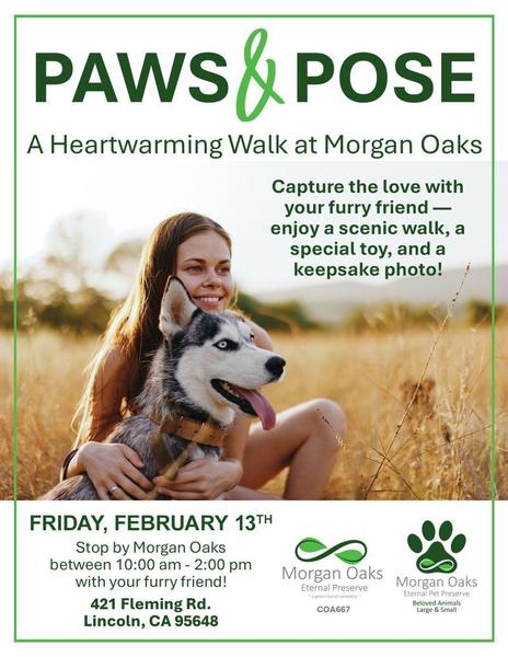 Paws & Pose at Morgan Oaks February 13 | 10:00 AM – 2:00 PM Location: Morgan Oaks Eternal Preserve As we prepare for Paws & Pose, we celebrate the unique love shared with our animal companions. This special event honors the joy, comfort, and connection pets